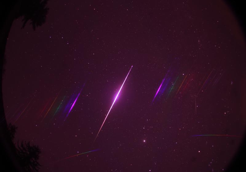 Obrázek 1. Bolid EN181125_040337 na snímku pořízeného automatickou spektrální širokoúhlou kamerou na stanici Evropské bolidové sítě v Tautenburgu v Německu. Na snímku letí bolid (nultý řád uprostřed spektra) od souhvězdí Lva do souhvězdí Velké Medvědice. Kromě nultého řádu je vidět 1. a-1. řád spektra, který velmi dobře odpovídá spektrům velmi rychlých kometárních meteoroidů, kde nejjasnější jsou čáry vápníku (fialová), hořčíku a železa (zelená), slabší je pak oranžový sodík a červené jsou čáry křemíku a kyslíku. Kromě spektra bolidu je ještě pod ním nápadné i spektrum planety Jupiter, která je v souhvězdí Blíženců. (foto: Astronomický ústav AV ČR).