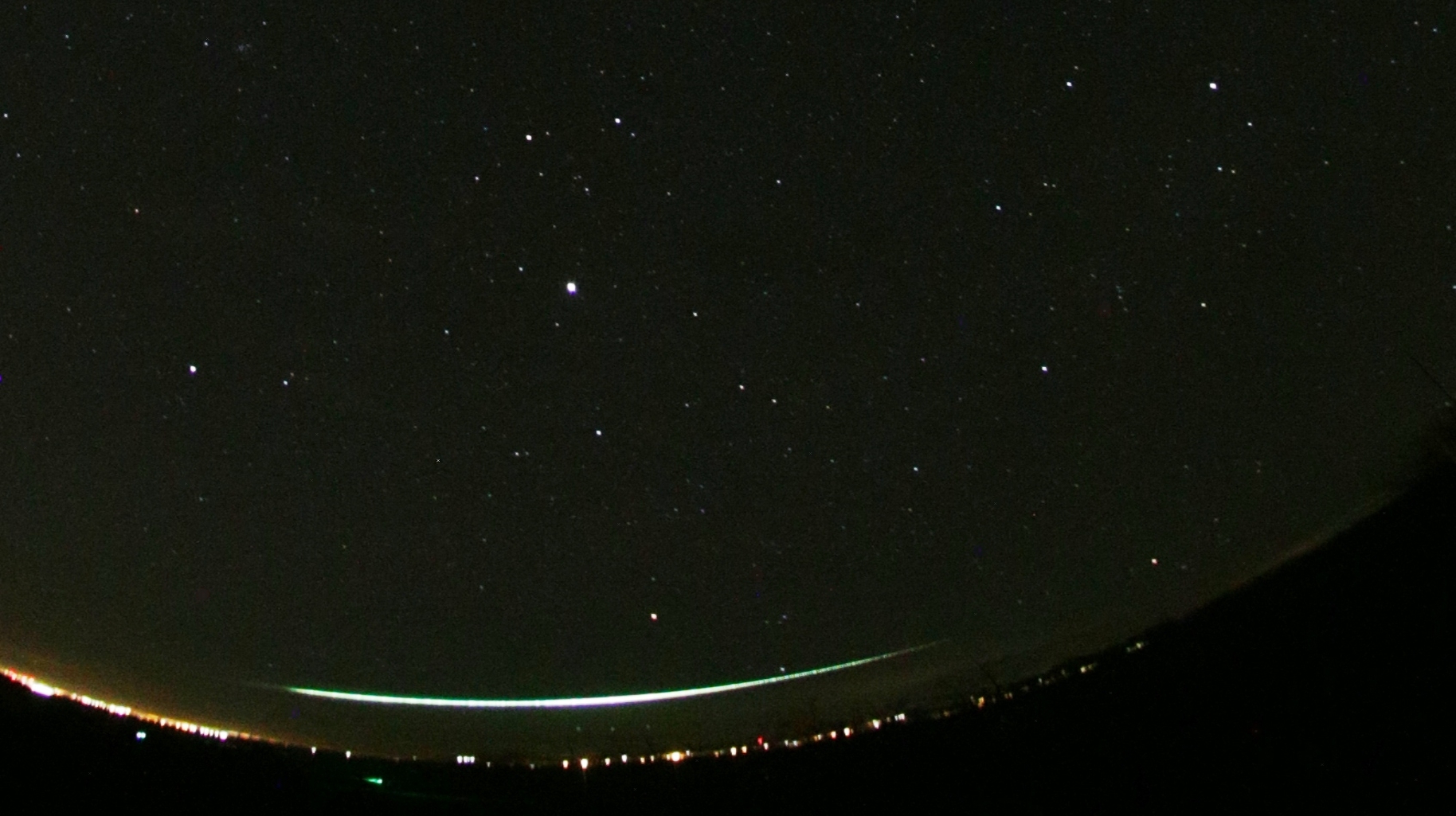 Obrázek 1. Výřez z celooblohového snímku bolidu EN120226_004140 pořízeného automatickou celooblohovou bolidovou kamerou na stanici Evropské bolidové sítě v Kuchařovicích u Znojma. Na snímku letí bolid nízko nad západním obzorem zleva doprava od souhvězdí Velkého psa skrz zapadající souhvězdí Orion až do souhvězdí Býka (foto: Astronomický ústav AV ČR).